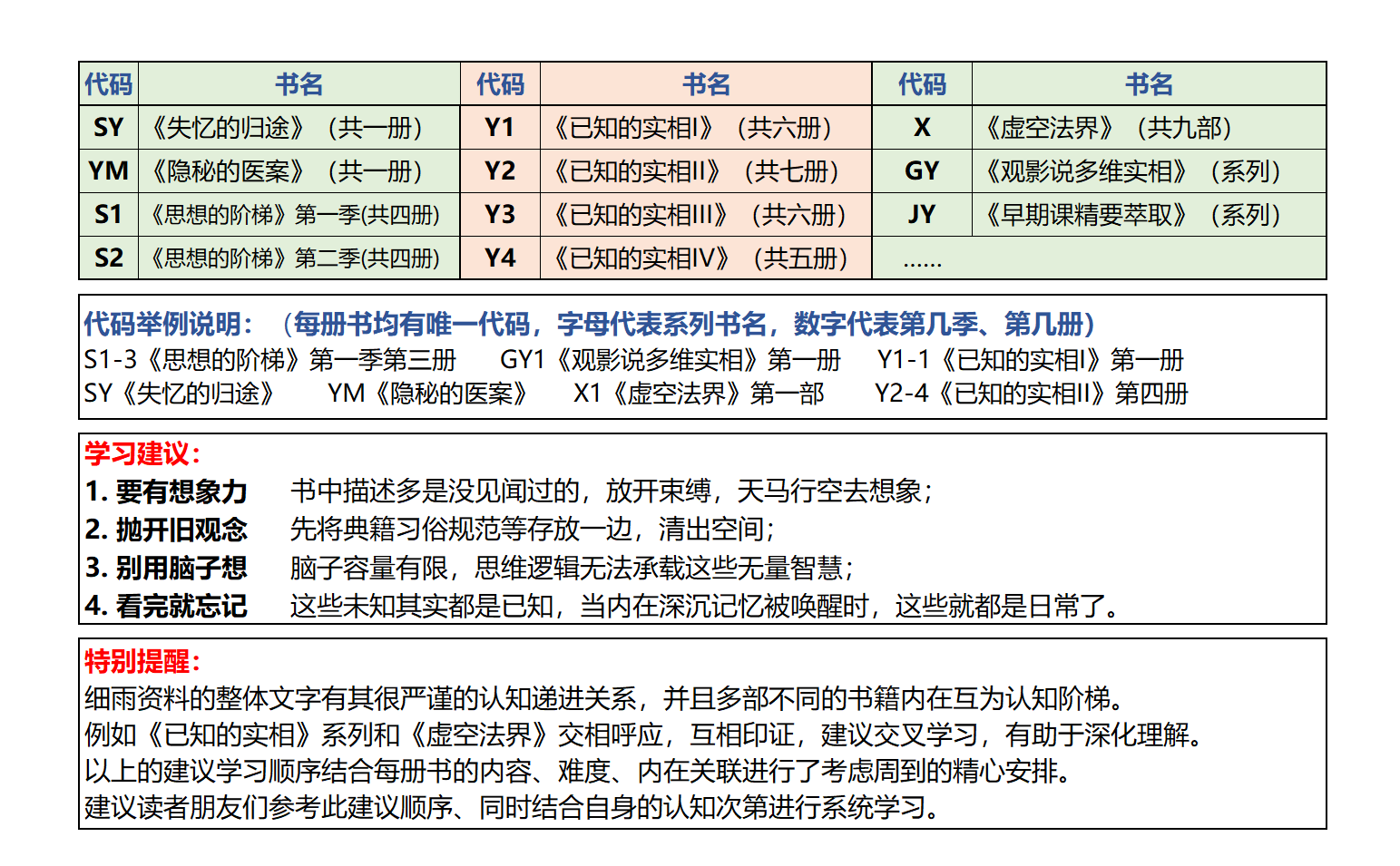 | 说明 | 本阶段阅读量多且密集, 是必要的筑基 | 建立新认知的必需基础 | 认知难度加大与深化,知识点建立与扩充 | 与高维沟通的信息,交换平台基本架构,修炼误区详解 | 观影写出自我知见,扩展识界,认知梦结构,消除执念 | 解析多重多元自我间的脉络道理与知行合一,多维自我间的整合经历演绎 | |||||||||||