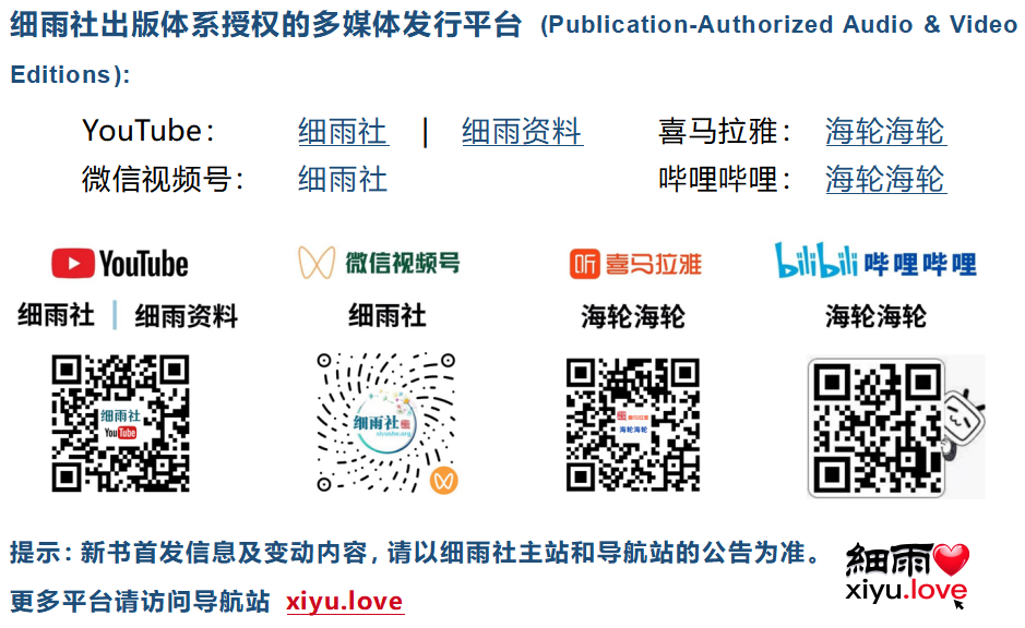 ◆最新出版电子书信息及内容变动,请关注细雨社公众号和细雨社导航网站xiyu.love——有声书、视频与多平台导航。